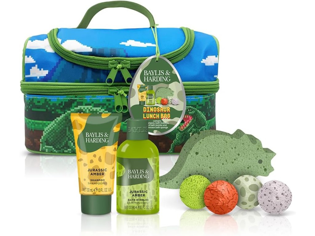 Vnútri tohto dinosaurieho peračníka nájdete množstvo kozmetických vychytávok, vrátane peny do kúpeľa, šampónu a šumivej bomby s dinosaurou tematikou. Všetko jemne prevoňané...