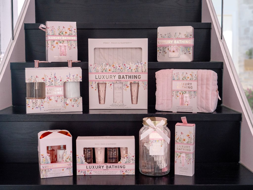 Luxusná darčeková sada na starostlivosť o telo s jemnou vôňou pivonky, malín a broskýň. Obsahuje sprchový gél, telový krém a hubku v elegantnej ružovej kozmetickej taštičke.