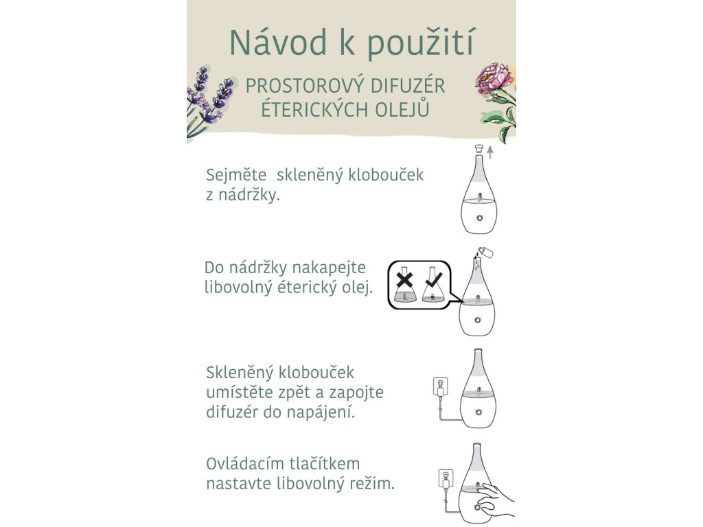 Stačí odskrutkovať sklenenú nádobku, nakvapkať pár ml éterického oleja (do difuzéra môžete taktiež použiť čisté hydroláty - pravé kvetové vody), uzavrieť a zapnúť. Difúzer počas chvíľky naplní priestor intenzívnou a čistou vôňou, ktorá pôsobí terapeuticky aj osviežujúcim spôsobom.