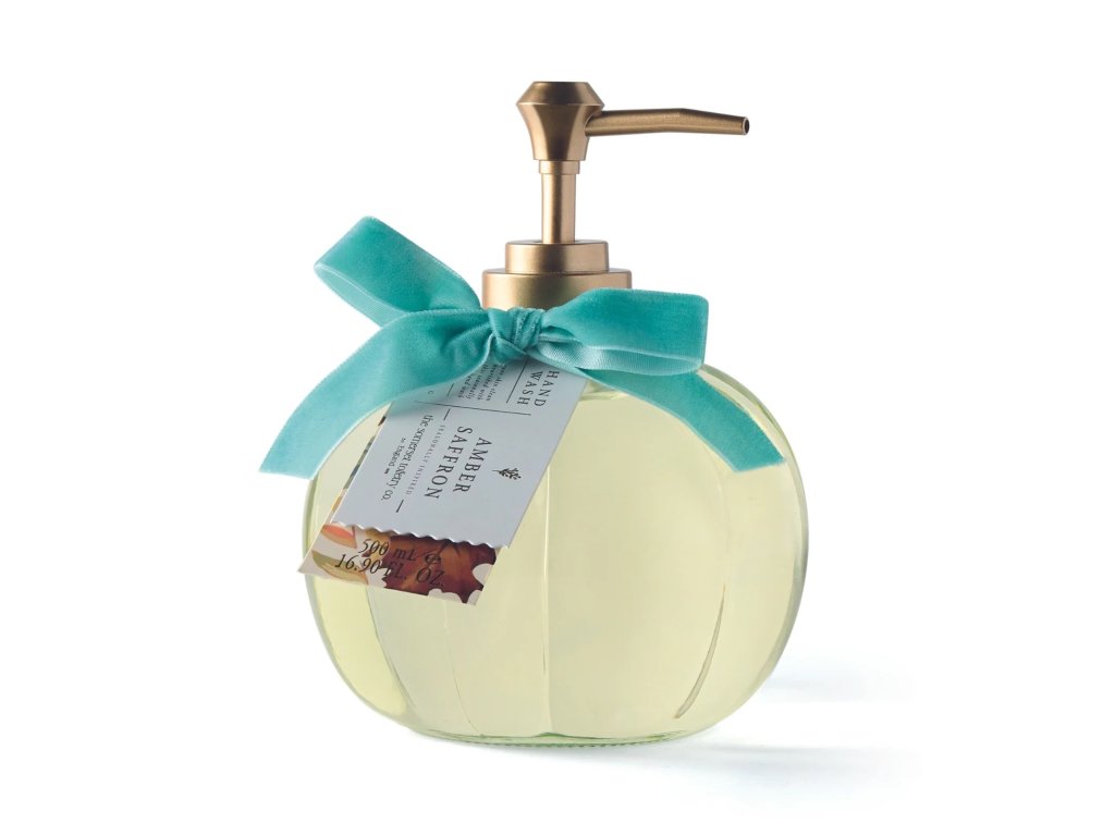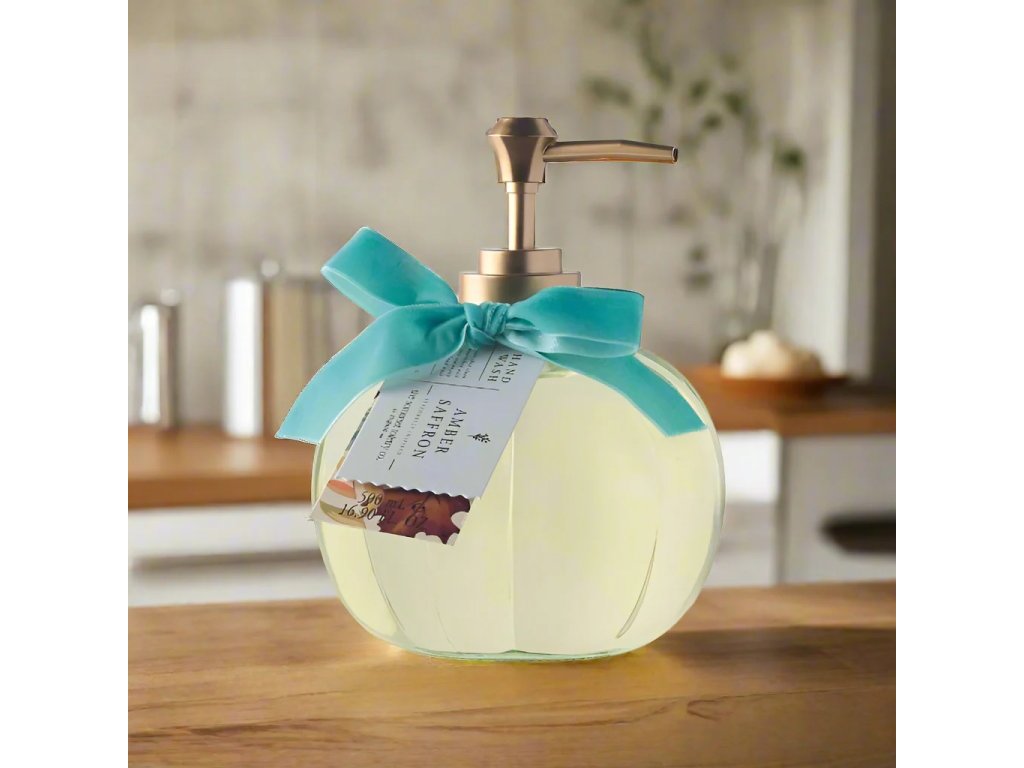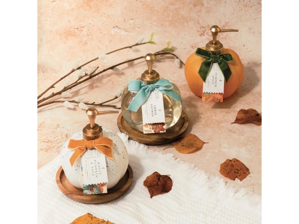 Podzimní tekuté mýdlo ve skle s vůní bílé dýně a šalvěje v elegantní lahvi ve tvaru dýně se sametovou mašlí. Šetrně čistí, provoní pokožku a ozdobí interiér.