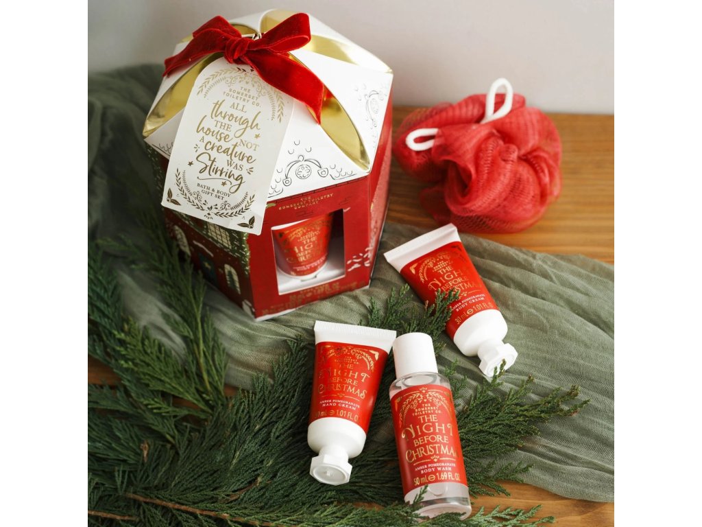 Obdarujte svojich blízkych alebo potešte sami seba štýlovou vianočnou sadou Amber Pomegranate. Krásne balenie v tvare sviatočného domčeka s mašľou ukrýva štyri produkty na dokonalú relaxáciu a starostlivosť.