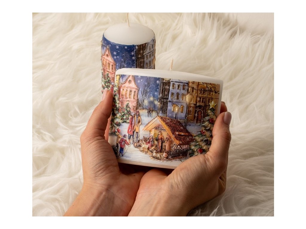 Na sviečke vyniká plastický farebný motív betlehema, zasneženého mesta a ozdobených vianočných stromčekov, ktorý pôsobí ako maľovaný obraz – živý, detailný a plný radosti. Každé zapálenie sviečky vytvára jemné teplé svetlo, ktoré zvýrazňuje farby a hĺbku reliéfu, čím vzniká očarujúca dekorácia pre sviatočné obdobie.