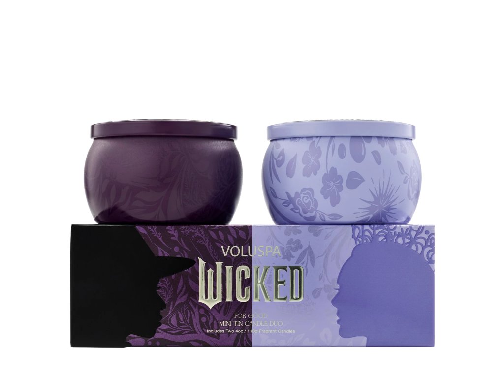 Každá mini sviečka je ručne nalievaná do elegantnej kovovej plechovej dózy s embosovaným zlatým rámčekom a ikonickými siluetami Glindy a Elphaby. Dizajn v odtieňoch pastelovej fialovej a temne smaragdovej podčiarkuje kontrast oboch vôní aj estetiku celej kolekcie Wicked.