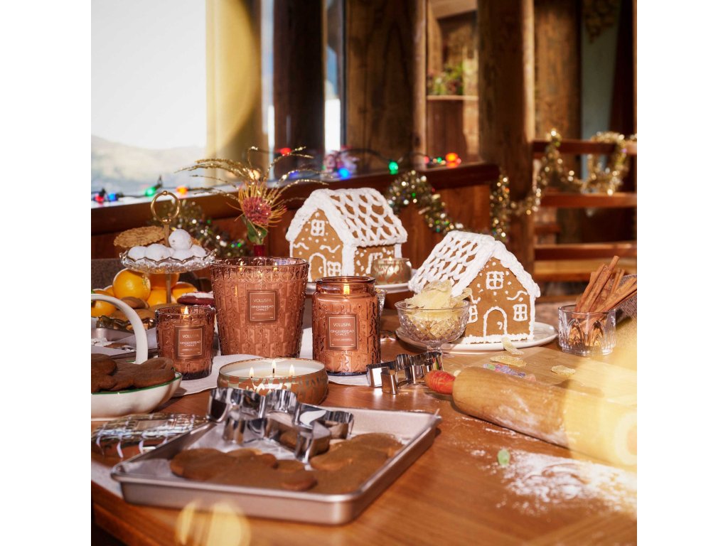 Sviečka Voluspa Gingerbread Chalet v klasickej veľkosti ukrýva jedinečnú zmes kokosového vosku a prírodného knôtu, ktorá pri horení uvoľňuje vôňu sviatočného domova.