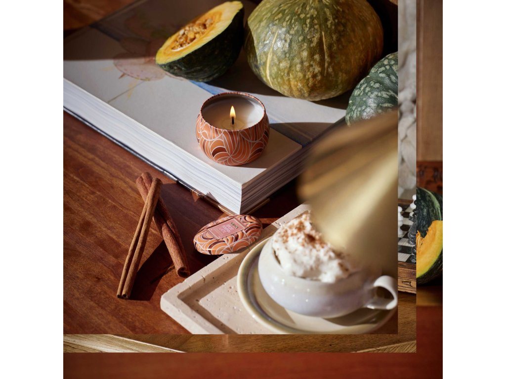 Sviečka Spiced Pumpkin Latte v praktickej plechovej dóze je ideálnym spoločníkom na cestách aj doma.