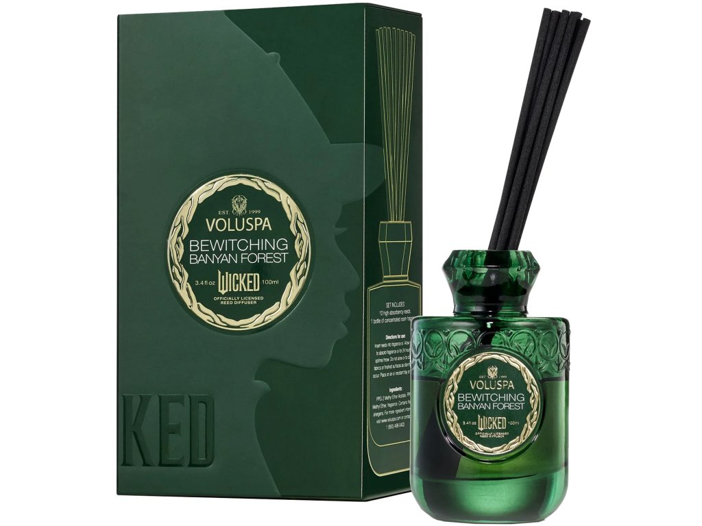 Difúzer Voluspa Bewitching Banyan Forest je usadený v luxusnom smaragdovo zelenom sklenenom flakóne, ktorého embosovaný vzor a temne žiarivý povrch odkazujú na ikonickú estetiku postavy Elphaby.
